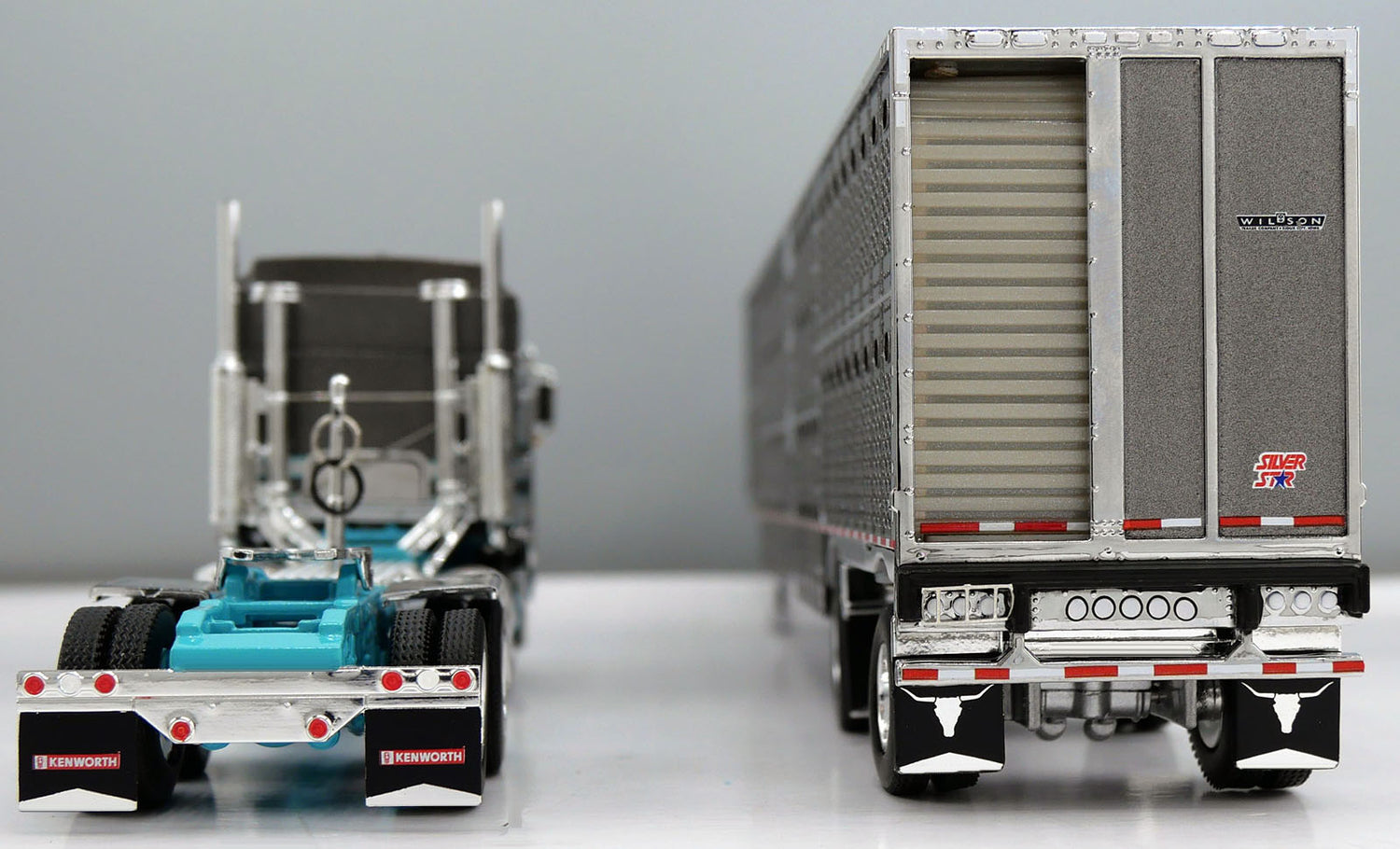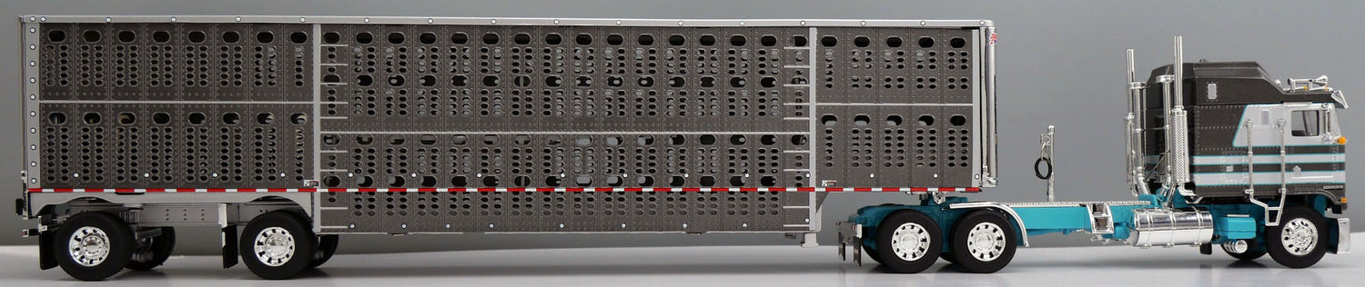 Gun Metal Gray / Teal Kenworth K100 COE Aerodyne Cab with Wilson Silverstar Livestock Gun Metal Sided Spread Axle Trailer